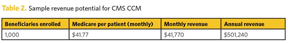 In the realm of CCM, there’s $41.77 per patient for each 20-minute visit (code 99490). Other revenue opportunities for CCM include: