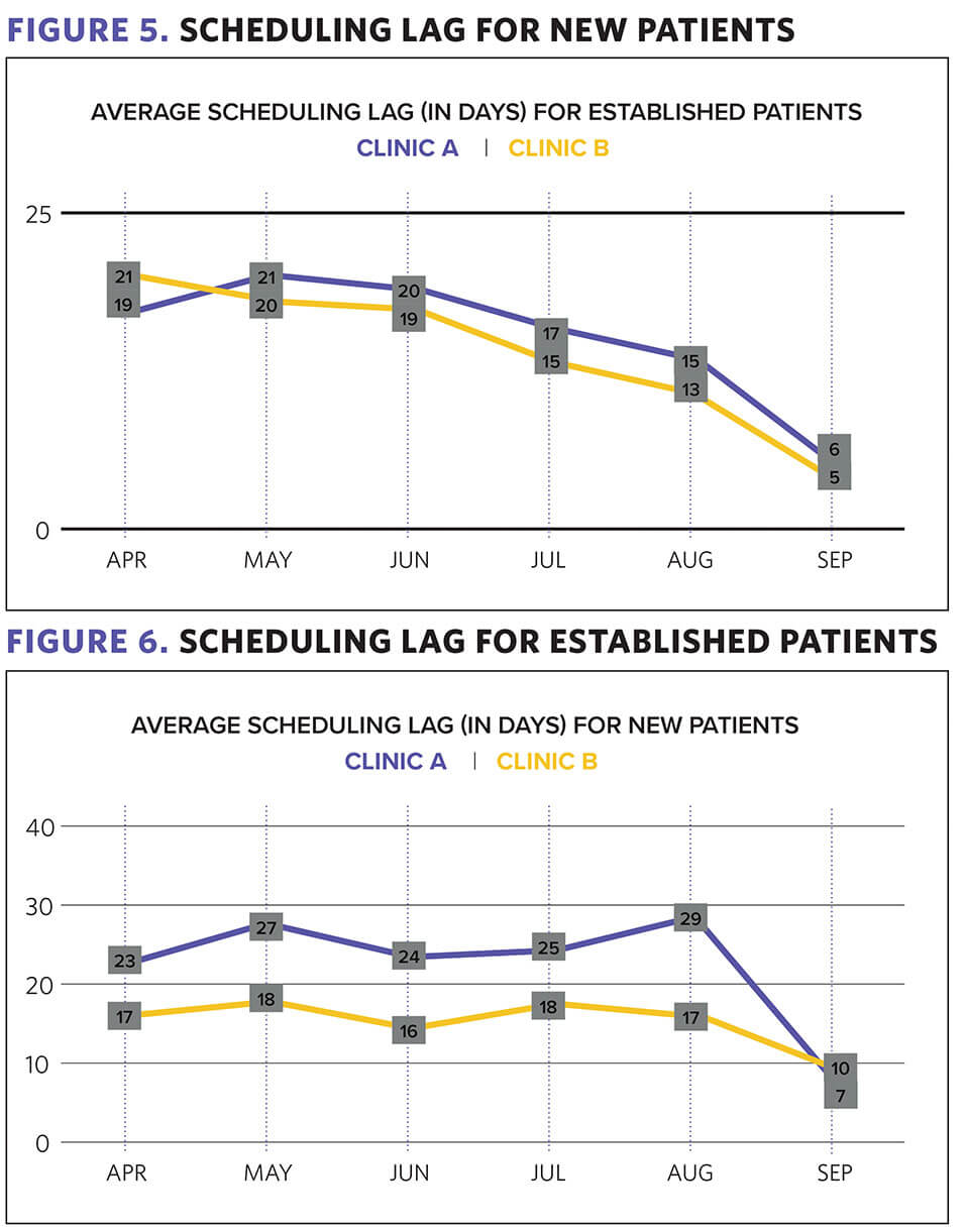 The Patient Capacity Management Tool was piloted with 20 PCPs in two clinics for three months. There was a 15% improvement in the average number of days for scheduling lag for new patients, and 41% improvement for established-patient scheduling lag (see Figures 5 and 6).