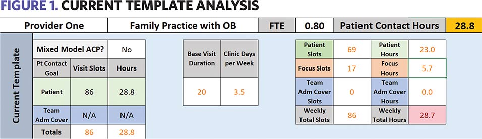 This tool is designed with an emphasis on work-life balance for the healthcare provider; therefore, it accounts for planned time away from the clinic for personal and professional development. The formula uses a ratio of 44 patient contact weeks for every 52 employed weeks (44/52). This ratio, 85% of the full-time equivalent (FTE), provides an estimated number of net bookable clinic days. The right side of Figure 1 shows an example of a provider’s actual slots and time in the clinic, which matches the necessary time and slots calculated for the FTE, shown on the left side. In this example, the provider is meeting the required minimum patient contact hours of 28.8.