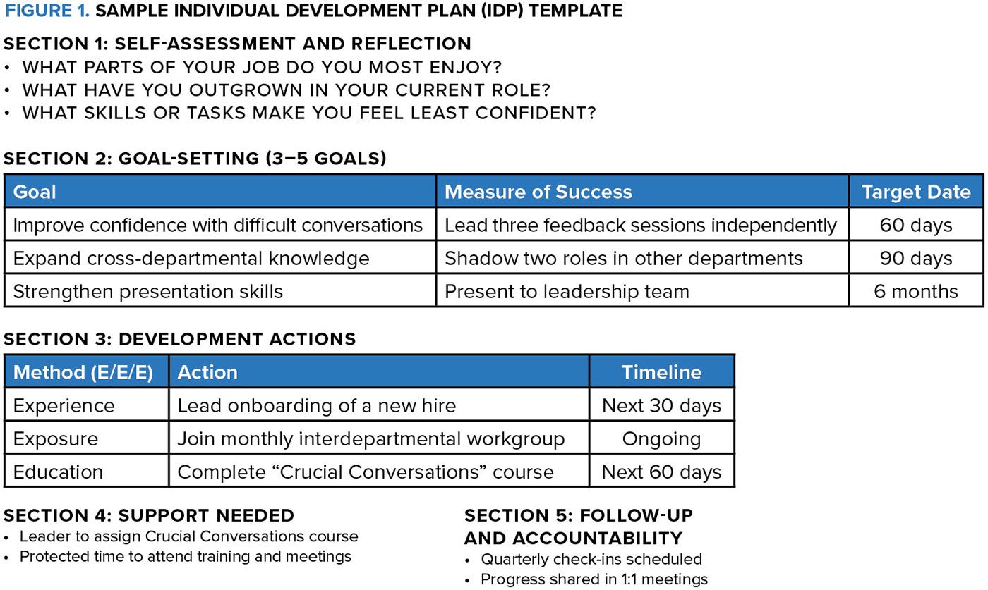 Too often, career development never advances beyond a performance review. This is why Schwartz and Hoffman recommend making individual development plans (IDPs) a standard part of the organizational toolkit.