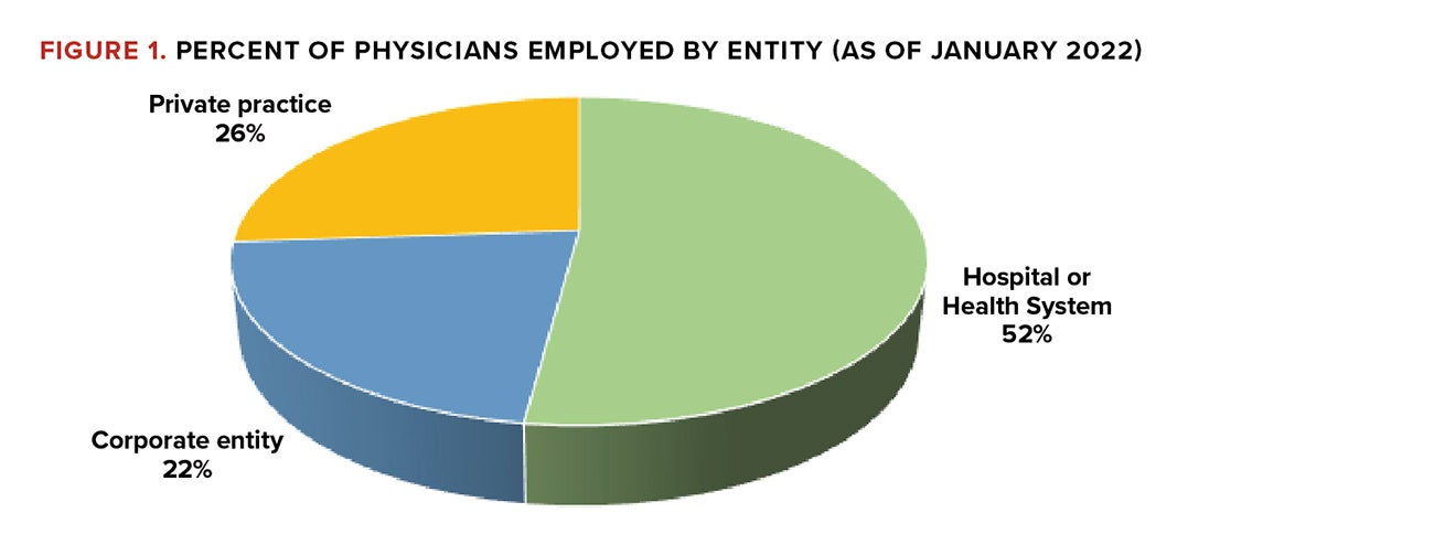 Not all physicians will have the same financial risk tolerance. This has certainly been a motivator for many physicians to become employed. According to a study by the Physicians Advocacy Institute, 74% of physicians in the United States were employed by a hospital, health system or other corporate entity as of Jan. 1, 2022.3 See Figure 1 for a breakout by employer type.