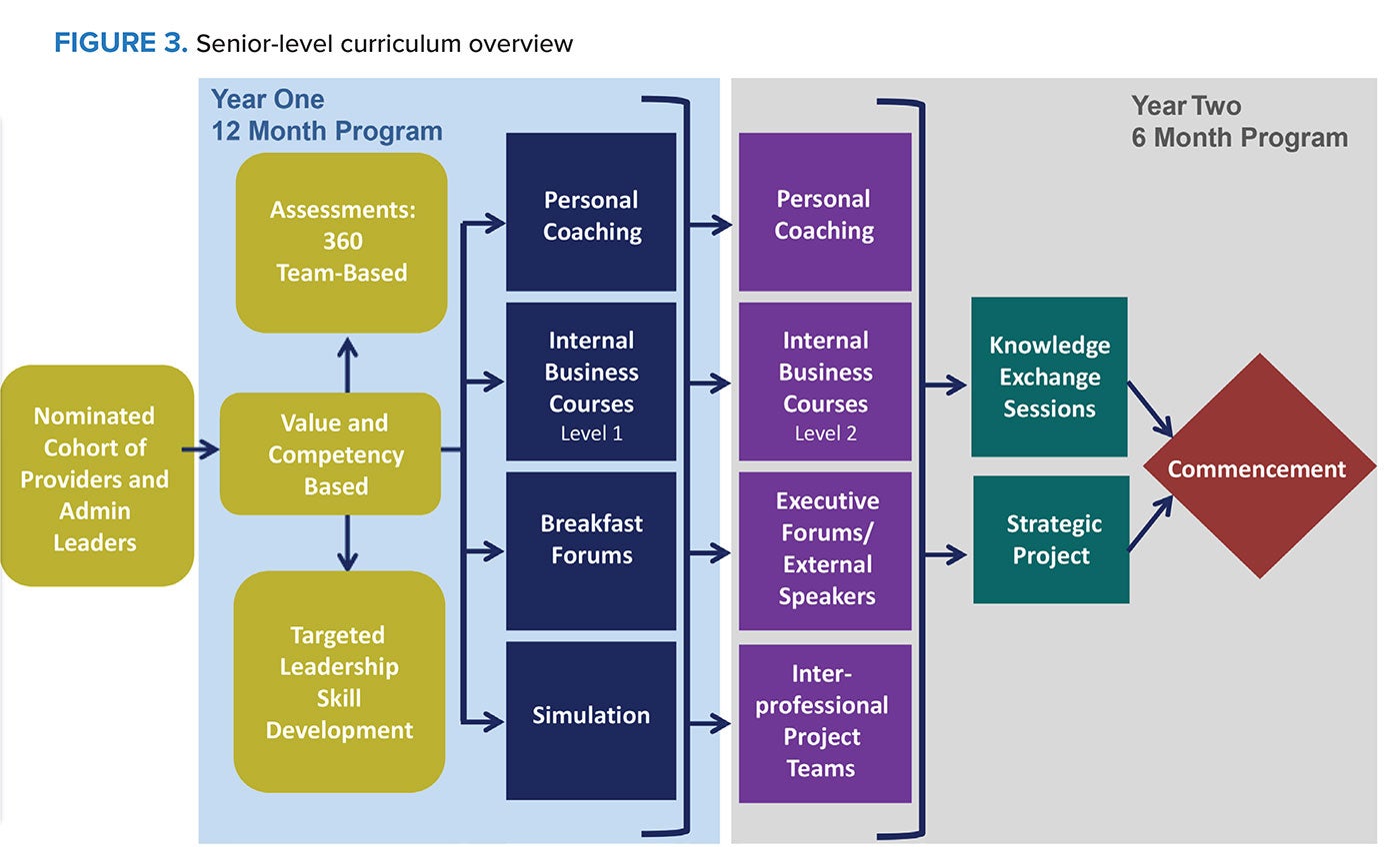 For senior-level leaders with high potential, the curriculum model can be extended to a two-year program (Figure 3). This approach “is a little more intensive from a time commitment and assessment commitment,” Aloi said, but it typically is more exclusive, with participants nominated by the executive team and medical staff leadership.