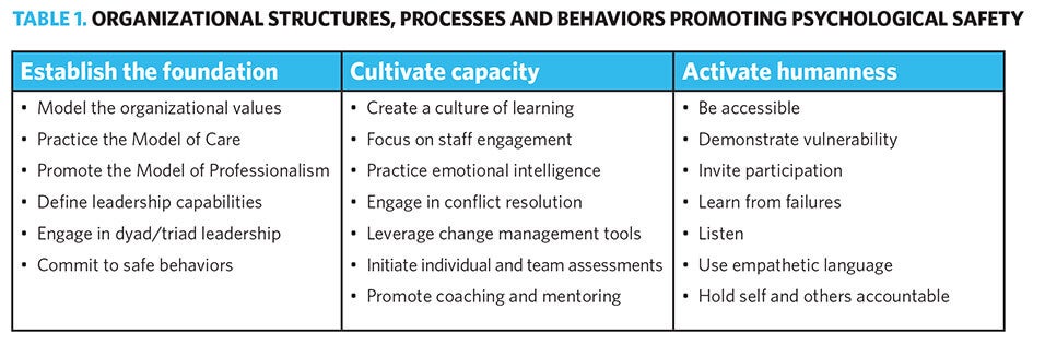 Table 2 identifies five leader behaviors, along with the experiences of leaders at Mayo Clinic. Specific behaviors in action are described along with tangible signs that psychological safety is present in the workplace. Frequent acknowledgment of accomplishments and sharing insights gleaned during failures contributes to a safe culture of learning.