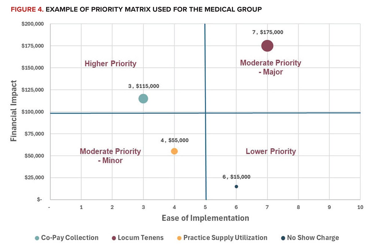 Consider a multispecialty medical group facing financial distress from declining reimbursements, labor shortages, and increasing expenses. Leadership identifies four potential actions to improve financial sustainability and uses a Priority Matrix to determine which to implement first.