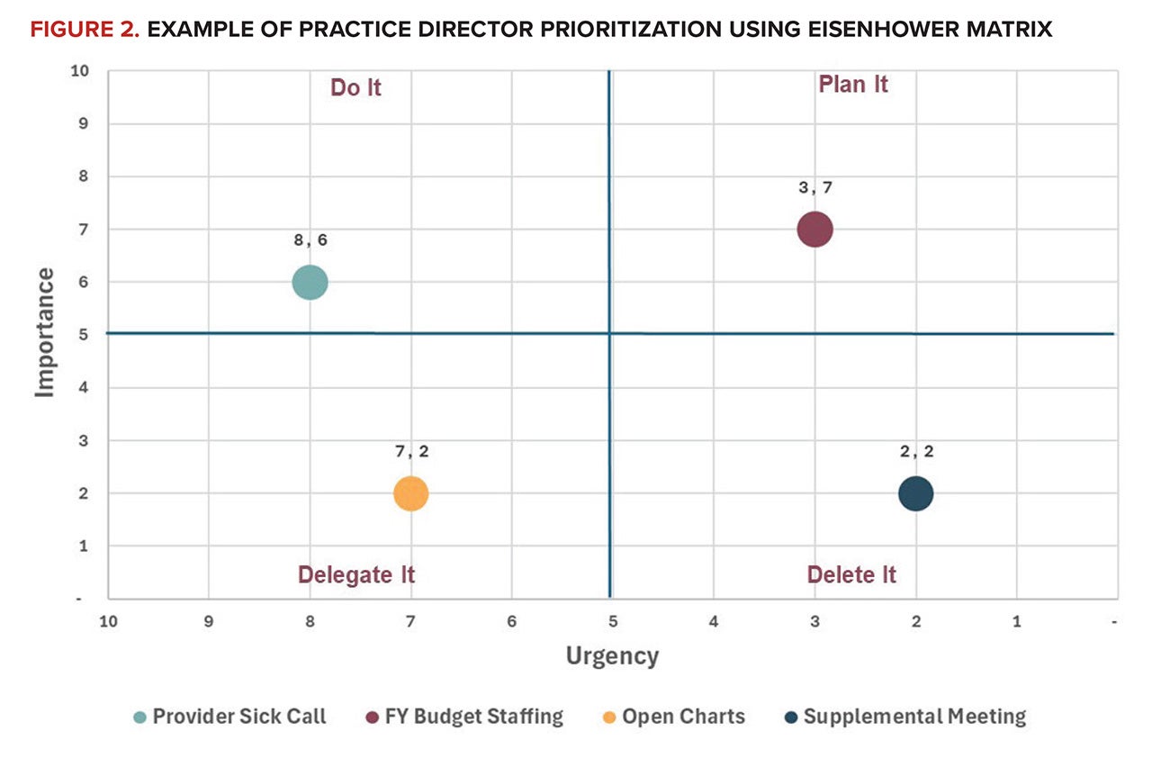 Take the example of a practice director at a hospital-employed, multispecialty medical group — a role with countless priorities every day, many of them driven by others’ priorities. In this example, the practice director plots their tasks on the Eisenhower Matrix. For illustration, consider four typical obligations: