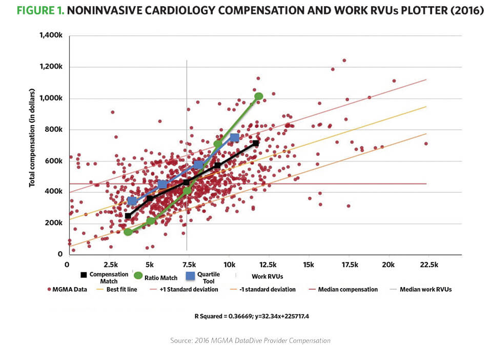 This view, however, does not square with the reality of the data. Figure 1 provides a scatter-plot diagram from MGMA’s pay-to-production plotter report from the 2016 MGMA DataDive Provider Compensation for noninvasive cardiology.