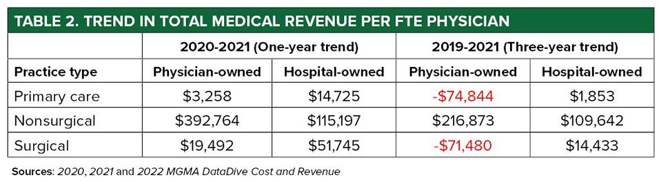 The same data set also reveals benchmarks for total medical revenue per FTE physician (Table 2) which — when trended across one and three years, respectively — give a sense for how different specialties and ownership structures fared in their pandemic recovery.