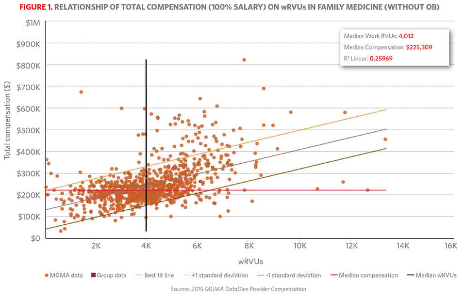Another important tool to use in your data work is the Pay-to-Production Plotter, which visualizes the relationship between data, such as provider compensation and productivity (see Figure 1), and help validate findings and make decisions about physician compensation plan changes.