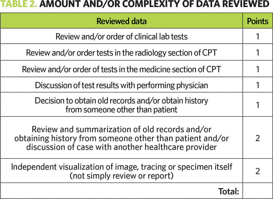Two points are assigned if the provider does not simply review test results but also visualizes the image, tracing or specimen. These points cannot be assigned if the provider is billing for the test, because this would amount to being paid twice. Data amount and complexity is also point-based and categorized as: