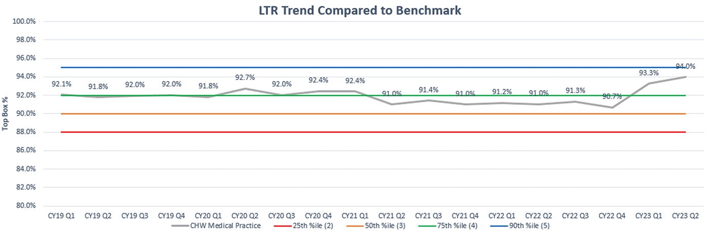 We also track how we are doing on our patient experience surveys and look at trends. Over the past five years across our medical group, we have seen fluctuations in both the measures of LTR and provider communication. This past year, we have seen steady increases in both areas and can attribute our provider onboarding program as one of the factors helping in these successes (Figures 1 and 2).