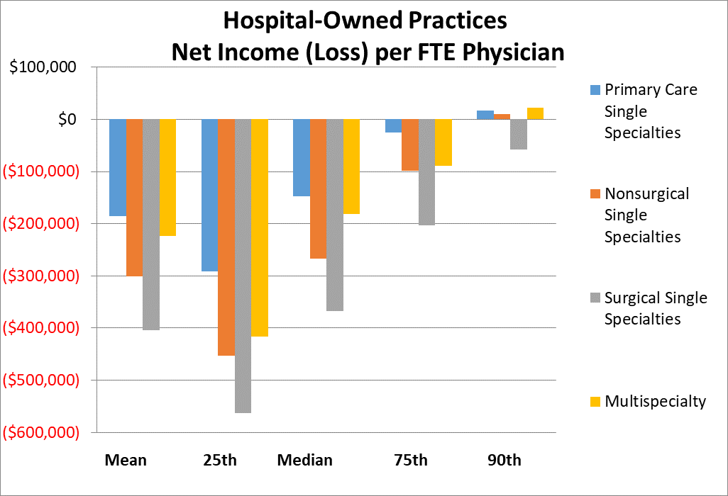 Two key takeaways emerge from reviewing MGMA’s data. First, hospital/IDS-owned practices generally lose money, with some of these losses being substantial. On the other hand, physician-owned practices usually break even or make money. Second, not all hospital/IDS-owned practices lose money; a small percentage will break even or make a profit.