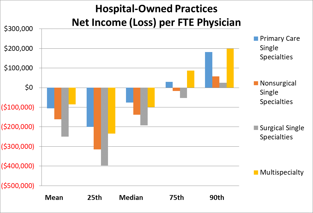The median for physician-owned practices indicates they essentially break even, while the top 10% of practices showed substantial profits, ranging from about $121,000 to nearly $300,000. Again, this same pattern has been observed in prior years: Physician-owned practices usually break even or make a profit.