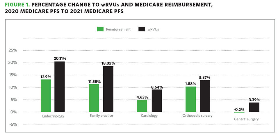 - Figure 1 illustrates the percentage change to wRVUs and Medicare reimbursement from 2020 Medicare PFS to 2021 Medicare PFS based on Medicare utilization data by CPT code, respectively for endocrinology, family medicine, cardiology, orthopedic surgery and general surgery specialties.16 In all specialty categories, the percentage change to wRVU was greater than the percentage change to reimbursement. This variance could result in significant changes to physician compensation. Practices need to perform financial scenario analyses and pro formas to help them quantify the financial impact to the group as well as to physicians individually.