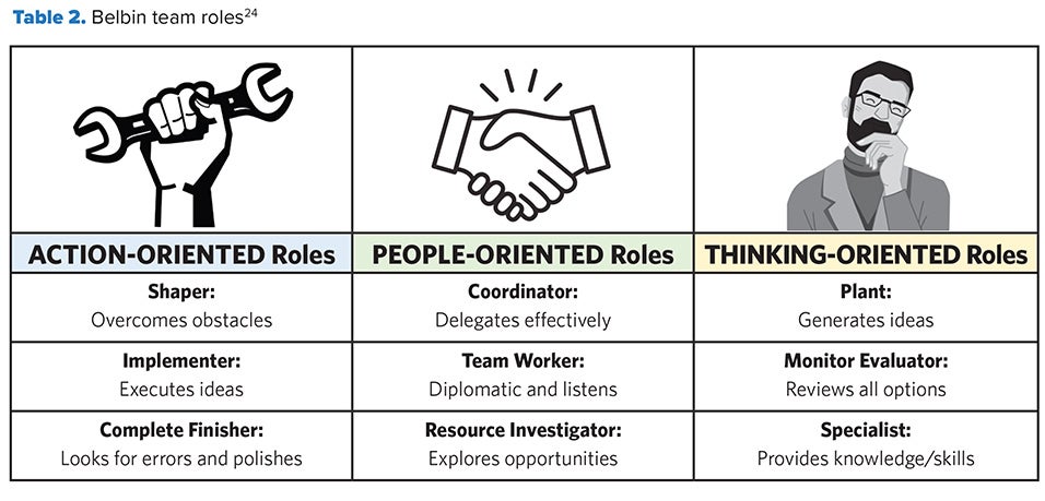 Team success can be predicted by the mix of these nine roles (shown in Table 2). Through this method, individuals maintain awareness of their strengths and approach to a team environment. It is critical to note that a team comprising all like-minded individuals may not result in the desired success. Based on Belbin’s extensive research, it is determined that team success is heavily rooted in a balanced mix of team roles, values, and mindset diversity.