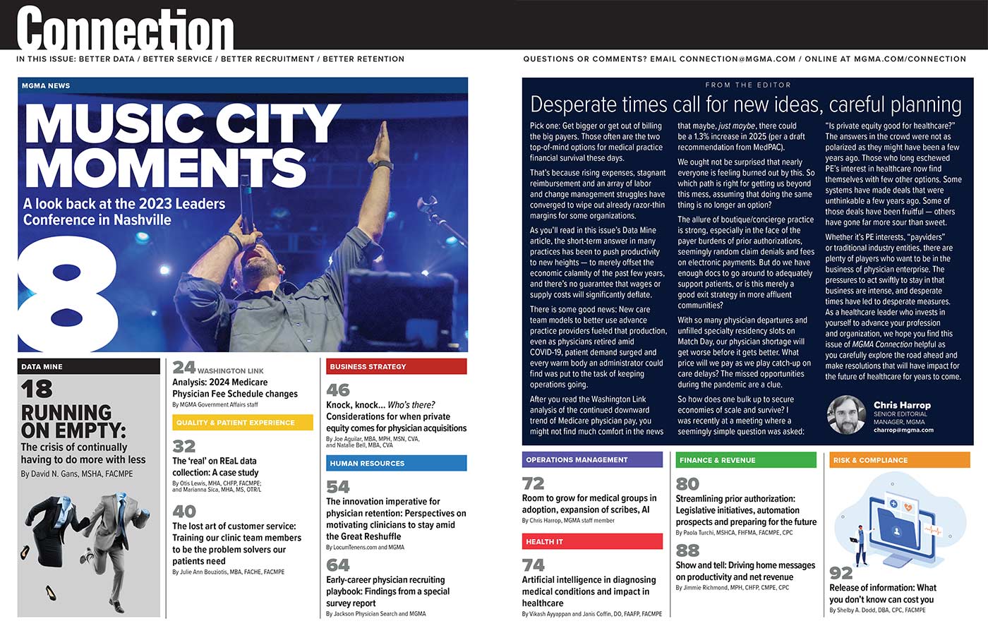 MGMA members enjoy exclusive access to MGMA Connection magazine.