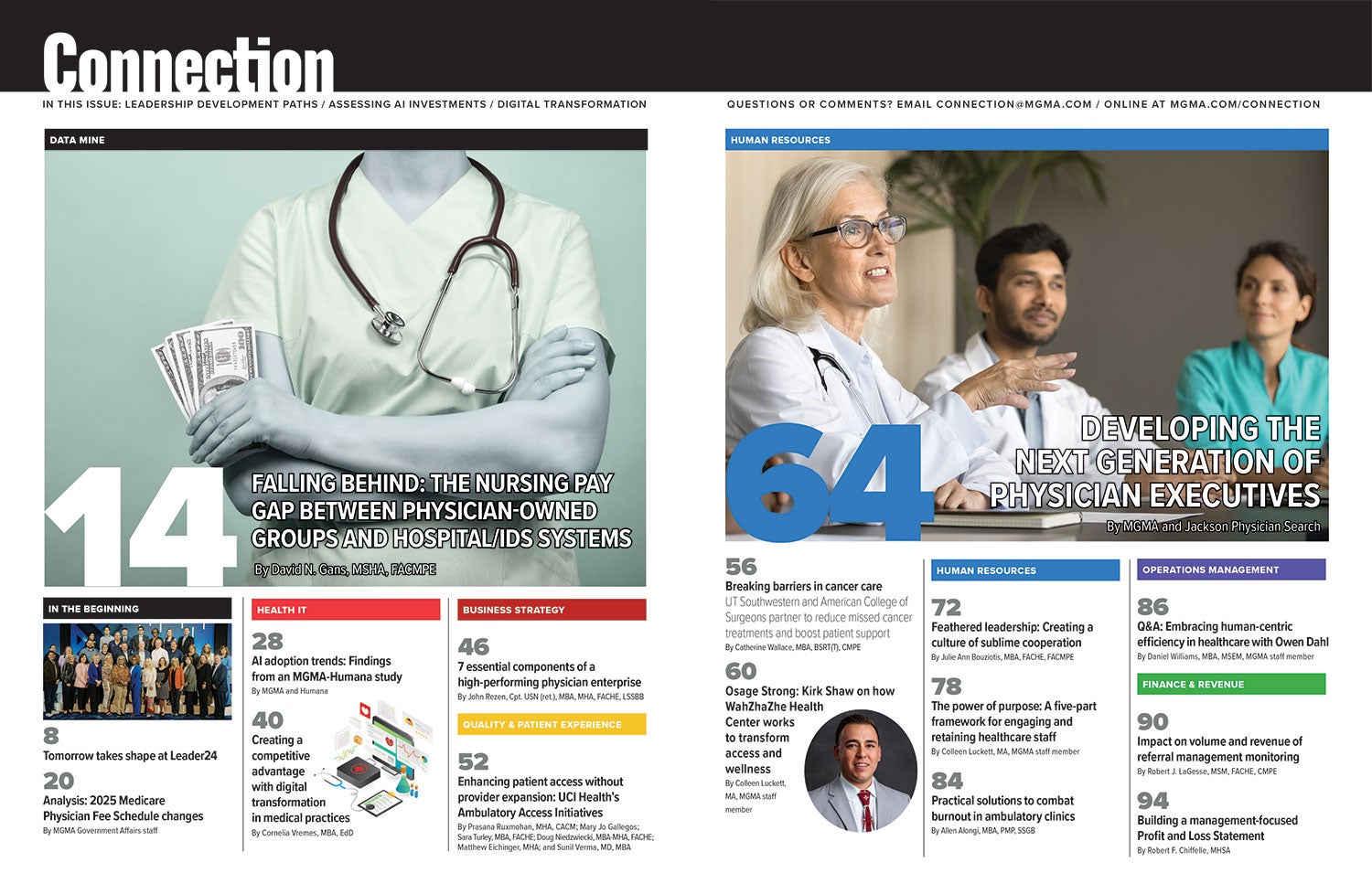 MGMA members enjoy exclusive access to MGMA Connection magazine.