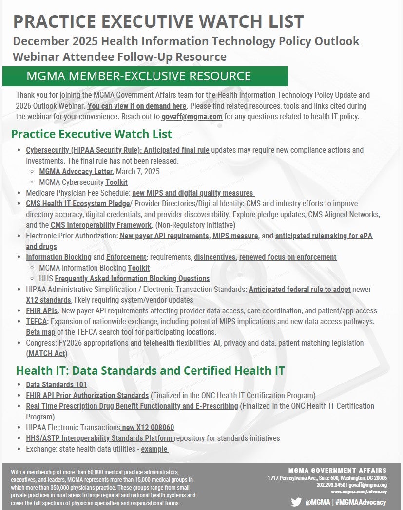 Thank you for joining the MGMA Government Affairs team for the Health Information Technology Policy Update and 2026 Outlook Webinar. You can view it on demand as an MGMA member by signing in. You can find related resources, tools and links cited during the webinar for your convenience. Reach out to govaff@mgma.com for any questions related to health IT policy.