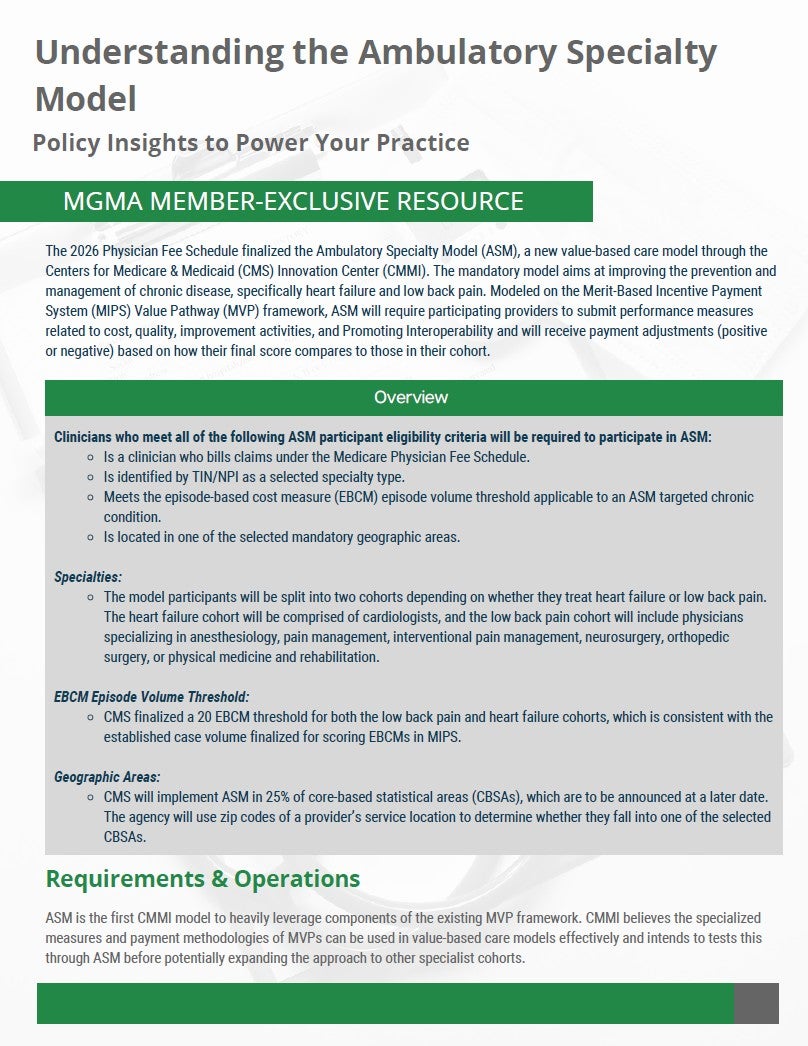 The 2026 Physician Fee Schedule finalized the Ambulatory Specialty Model (ASM), a new value-based care model through the Centers for Medicare & Medicaid (CMS) Innovation Center (CMMI). The mandatory model aims at improving the prevention and management of chronic disease, specifically heart failure and low back pain. Modeled on the Merit-Based Incentive Payment System (MIPS) Value Pathway (MVP) framework, ASM will require participating providers to submit performance measures related to cost, quality, improvement activities, and Promoting Interoperability and will receive payment adjustments (positive