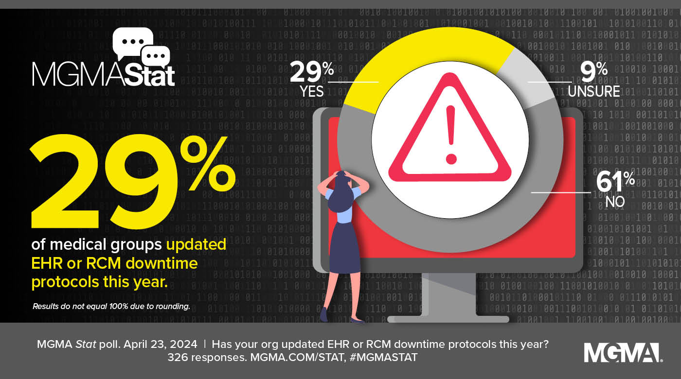 An April 22, 2024, MGMA Stat poll found that 29% of medical groups reported making updates to the EHR or revenue cycle system downtime protocols in the past year, compared to 61% who have not and another 9% who were unsure. [Figures do not equal 100% due to rounding.] The poll had 326 applicable responses.