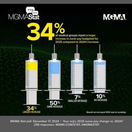 A Sept. 9, 2025, MGMA Stat poll sought to give these leaders a sense of what their peers are doing when it comes to compensation: Nearly two-thirds (64%) of medical groups are targeting a 1% to 3% increase in base pay for staff in their 2026 budgets, while almost one in four (23%) have 4% to 6% increases built into their budgets, and just 1% have an average increase of 7% or more. Another 10% say they have no increase budgeted for base pay specifically. The poll had 349 applicable responses.