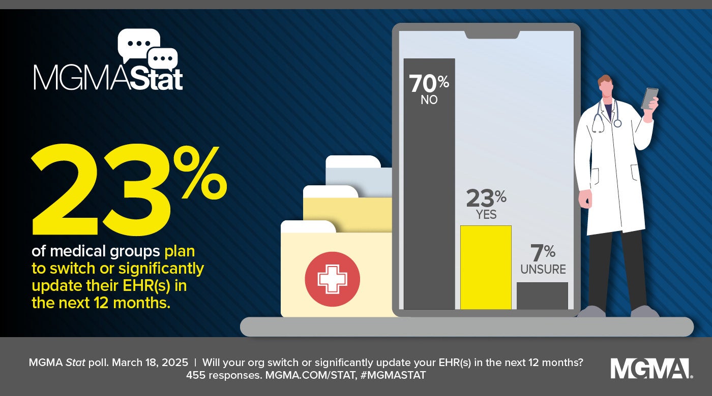 A March 18, 2025, MGMA Stat poll finds that 23% of medical group practice leaders expect to switch or significantly update their EHR(s) in the next 12 months, while 70% do not and 7% were unsure. The poll had 455 applicable responses.