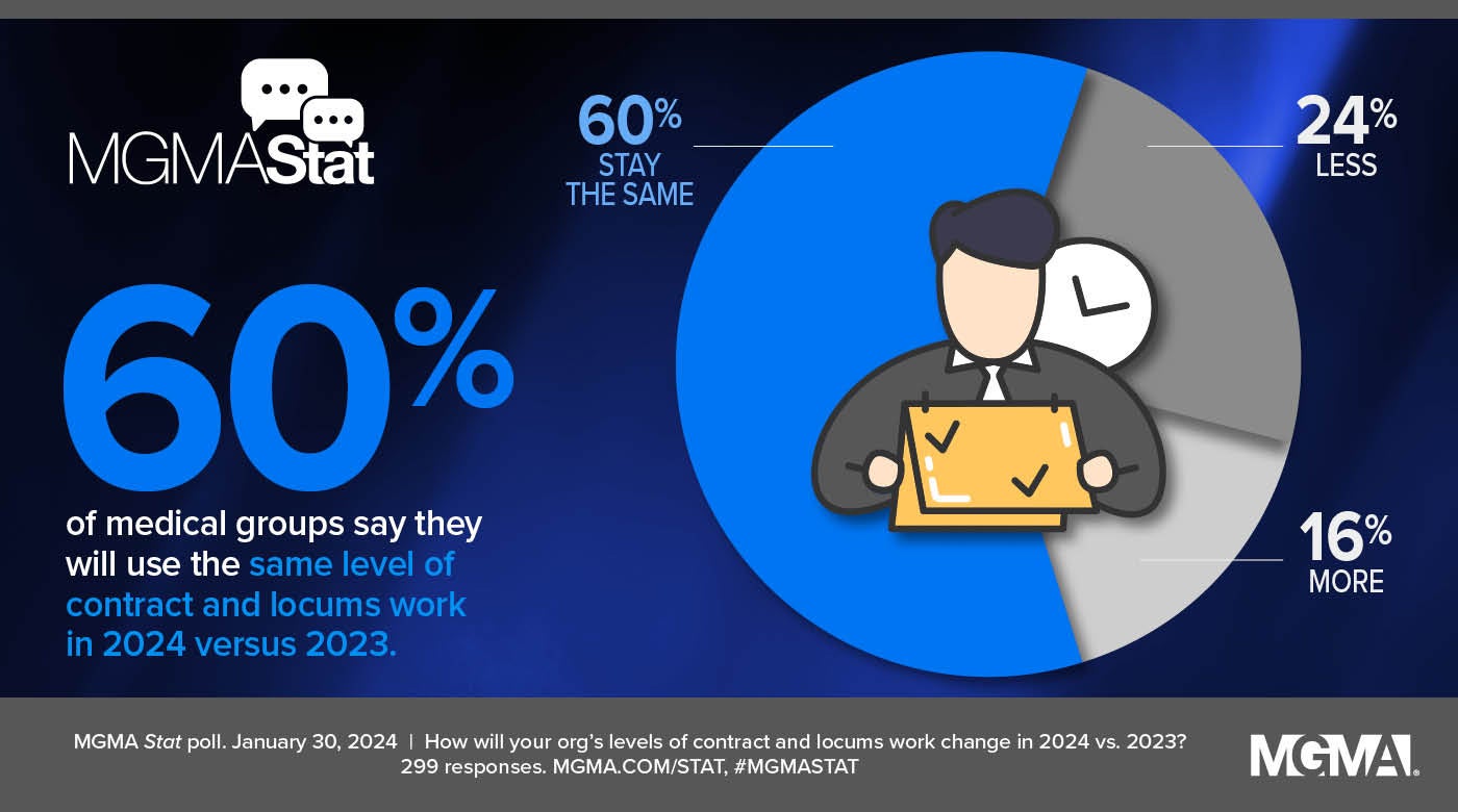 - Among medical group leaders who expect their contract and locum tenens work to expand in 2024, most of them only cited the need for locums physicians, with only a few focused on temporary help among physician assistants (PAs), nurse practitioners (NPs) and administrative workers.