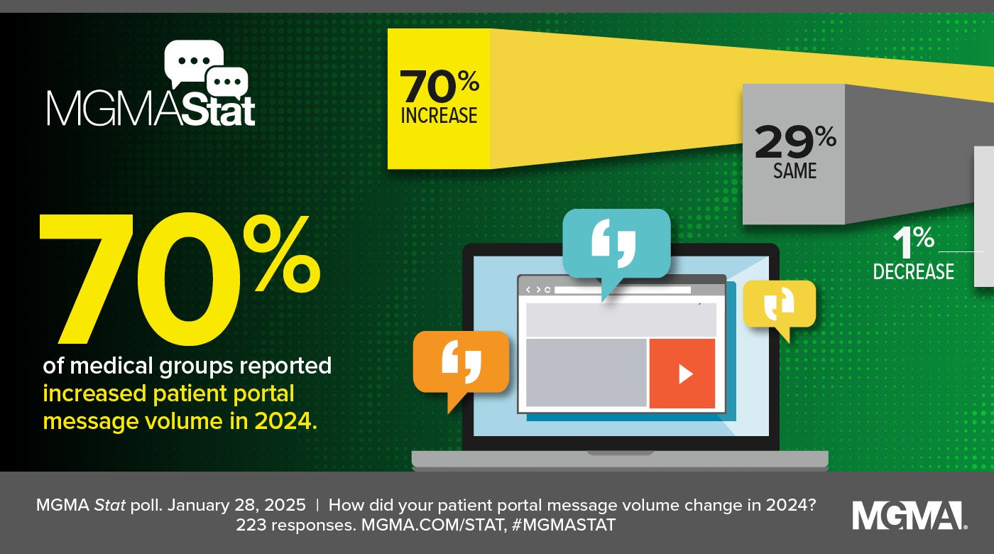 A Jan. 28, 2025, MGMA Stat poll finds that seven out of 10 (70%) of medical groups reported an increase in patient portal message volume in 2024, while 29% noted volume was about the same and only 1% reported a decrease in portal messages. The poll had 223 applicable responses.