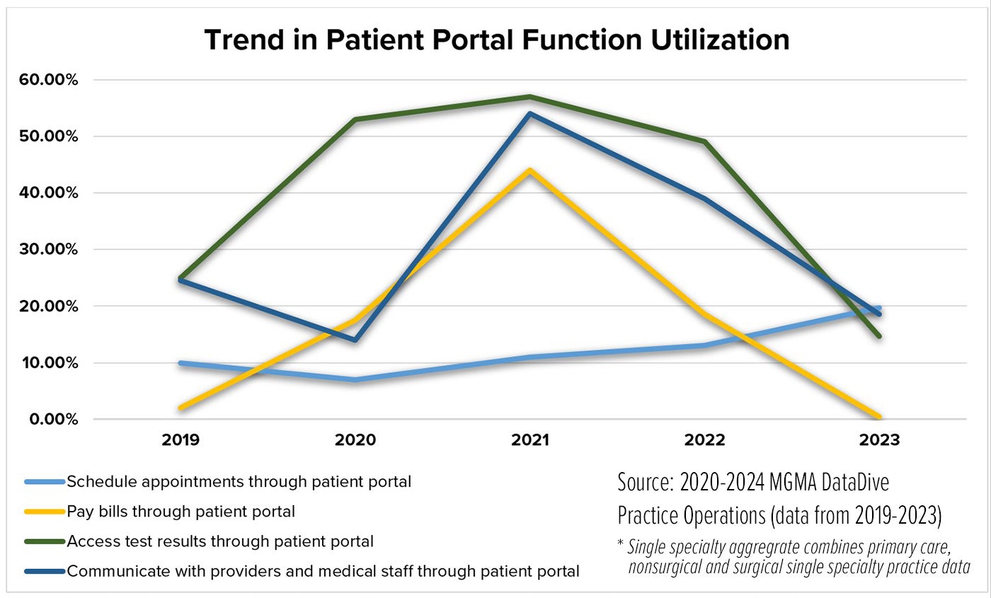 Since 2019, use of patient portal messaging to contact physicians for non-urgent matters surged as COVID-19 pandemic limits on in-person visits shifted more patients to telehealth, though some elements of portal use have ebbed in the years since as many practices returned to normalcy.