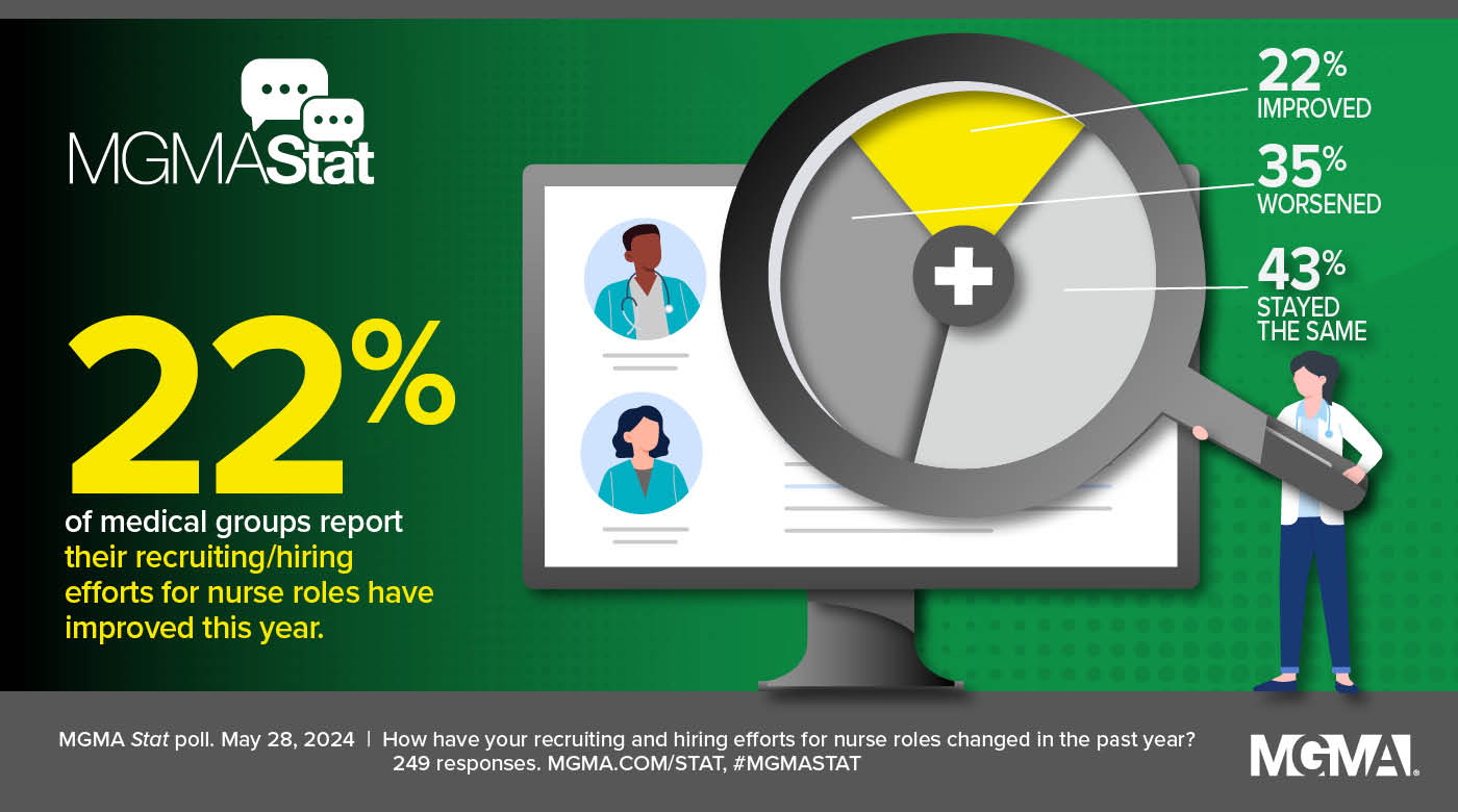 A May 28, 2024, MGMA Stat poll finds that 22% of medical group leaders say their nurse recruitment and hiring efforts improved in the past year, while the majority (78%) say they have seen little change (43%) or experienced worsened conditions (35%). The poll had 249 applicable responses.