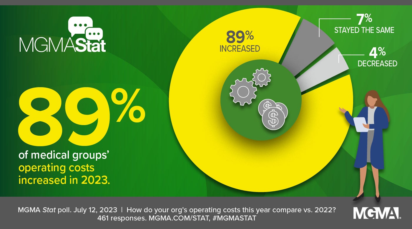 A July 12, 2023, MGMA Stat poll finds that 96% of medical groups have seen their operating costs increase (89%) or stay the same (7%) compared to 2022, while only 4% report a decrease in those costs versus last year. The poll had 461 applicable responses.
