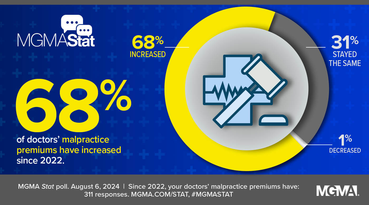 An Aug. 6, 2024, MGMA Stat poll found that nearly seven in 10 (68%) medical groups reported an increase in their doctors’ malpractice premiums since 2022, while 31% noted these costs stayed the same over the past two years. Only 1% of respondents noted they saw malpractice premiums decrease over that period. Among medical groups with increased premiums, there was an average 11% increase since 2022.