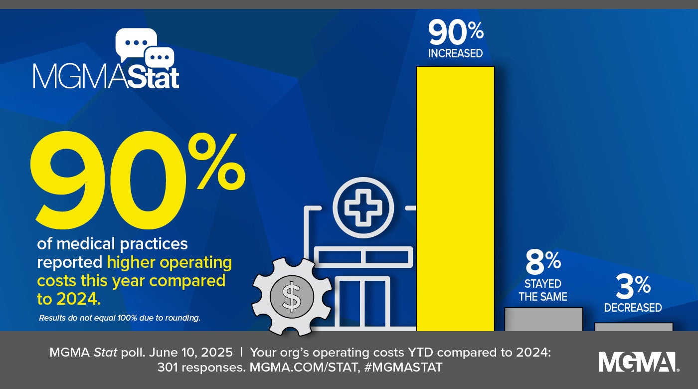 This is especially crucial now, as 90% of medical groups report that year-to-date operating costs are higher than at the same point in 2024, according to a June 10, 2025, MGMA Stat poll. Another 8% reported that costs have stayed about the same, while only 3% noted a decrease. These findings reflect only the slightest of improvement in the trend seen in a June 2024 MGMA poll, in which 92% of medical groups reported higher costs compared to 2023.