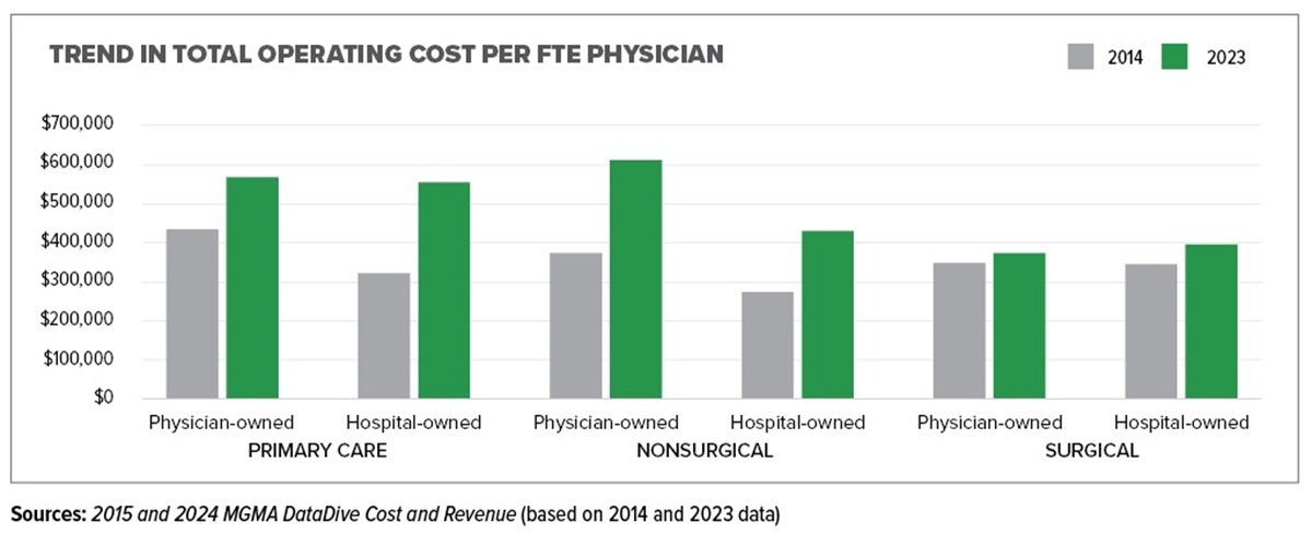 In 2023, physician-owned practices (excluding primary care) reported lower total expenses, largely due to leaner staffing. In contrast, primary care practices increased their staffing levels, driving up overall costs. Meanwhile, hospital-owned practices reported higher operating costs for the third year in a row. [Editor’s note: 2024 benchmarks will be available later this summer in the 2025 MGMA DataDive Financials and Operations data set.]