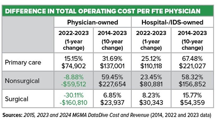 As the graph above illustrates, surgical specialties have done a better job of controlling total operating costs per full-time-equivalent (FTE) physician over the past decade than their counterparts in primary care and nonsurgical specialties. Total operating cost includes total support staff expenses and general operating expenses.