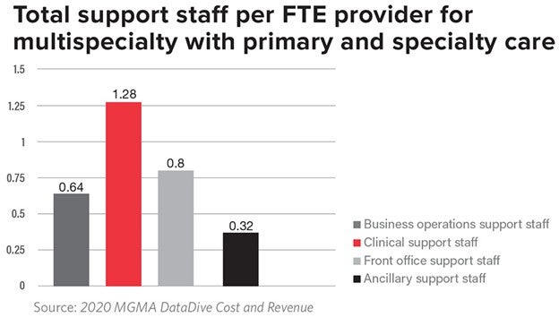 Similarly, information from the 2020 MGMA DataDive and associated reports demonstrates important clinical support staff trends as being: