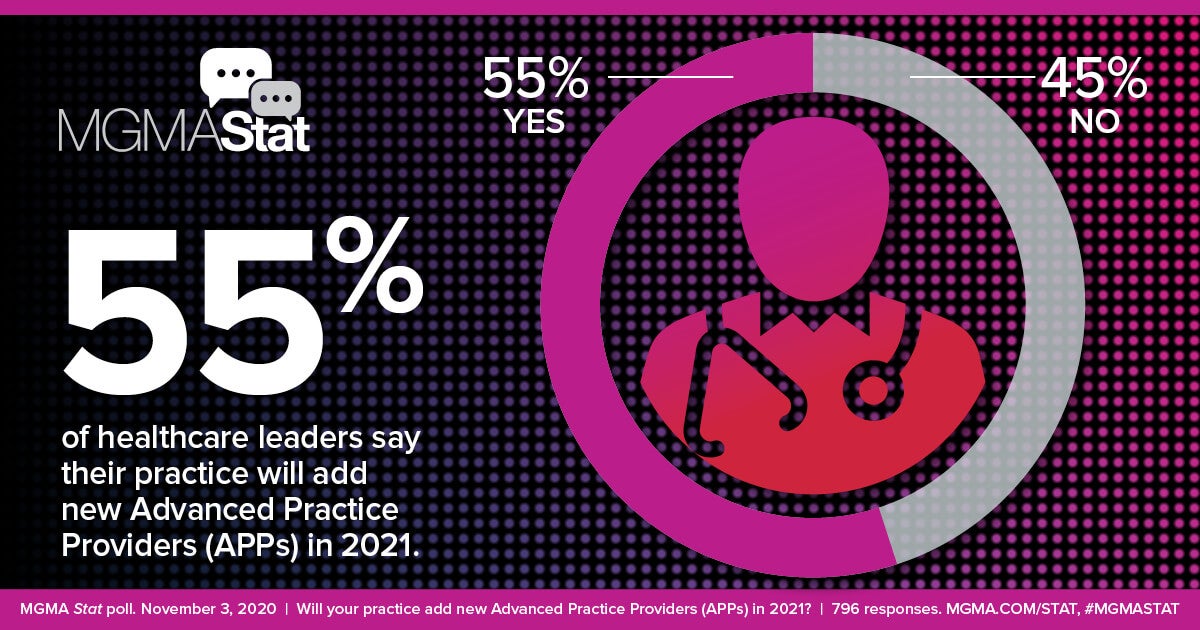The Medical Group Management Association’s most recent MGMA Stat poll asked healthcare leaders, “Will your practice add advanced practice providers (APPs) in 2021?” The majority (55%) said “yes,” compared to 45% who responded “no.”