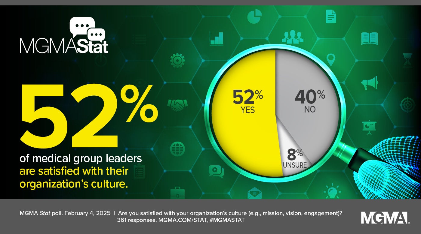 A Feb. 4, 2025, MGMA Stat poll found that more than half (52%) of medical group leaders say they are satisfied with their organization’s culture — as reflected in their mission, vision and engagement — while 40% were not satisfied. Another 8% were unsure. The poll had 361 applicable responses.