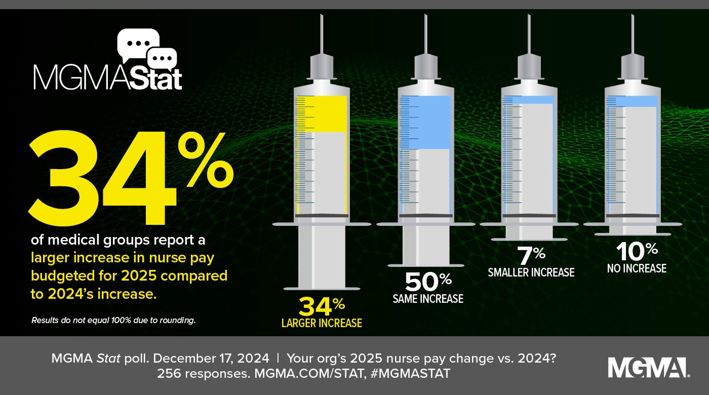 A Dec. 17, 2024, MGMA Stat poll finds that 84% of medical group leaders report budgeting a larger increase (34%) or the same increase (50%) in nurse pay for 2025 as compared to compensation gains budgeted for 2024, while 7% say the coming year’s pay increase will be smaller than 2024’s increase, and 10% report no increase relative to last year. The poll had 256 applicable responses.