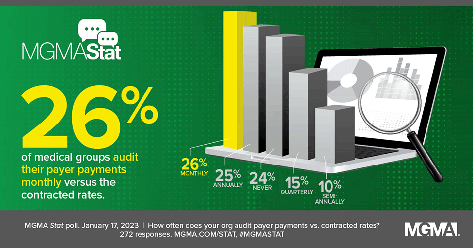 These results show an increasing frequency of these audits compared to a Jan. 5, 2021, MGMA Stat poll, which found that nearly half (47%) of groups only audited payments versus contracted rates annually, followed by: