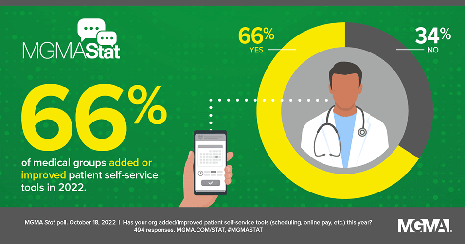 An Oct. 18, 2022, MGMA Stat poll found that two-thirds (66%) of medical practices added or improved patient self-service tools — such as scheduling, online bill pay and more — in the past year, while 34% had not. The poll had 494 applicable responses.