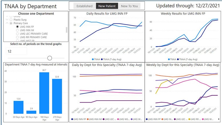 The figure above shows that graph for an orthopedic group in the Midwest. Notice the spike every seven days or so: A provider was telling patients, “If it still hurts, come back and see me in four weeks.” The patients would book that appointment for four weeks out, knowing it might be difficult to book closer to the four-week mark.