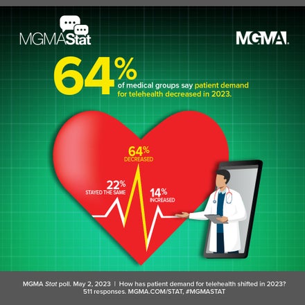 The poll had 572 applicable responses. These results align with an Oct. 19, 2021, MGMA Stat poll that found seven in 10 practices expected patient demand for telehealth to stay the same or increase in 2022.