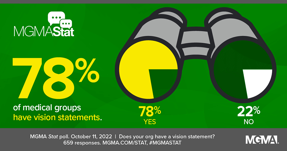 An Oct. 11, 2022, MGMA Stat poll found that nearly 8 in 10 (78%) medical group practice leaders said their organization has a vision statement, while 22% do not. The poll had 659 applicable responses.