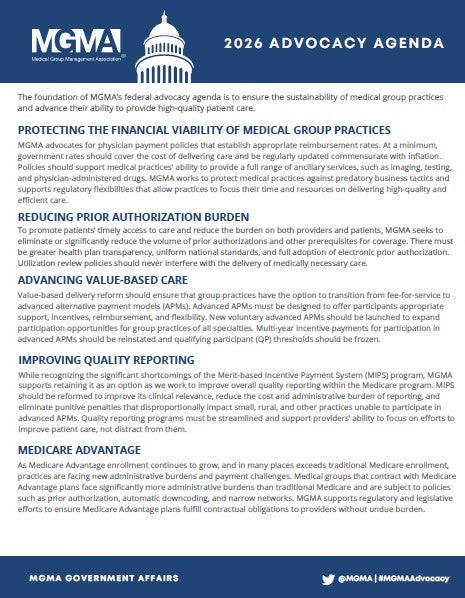 The foundation of MGMA’s federal advocacy agenda is to ensure the sustainability of medical group